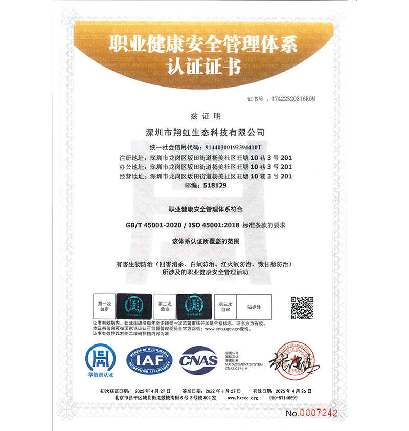 深圳市翔虹生態科技有限公司成立于1995年,是深圳最早成立的專業蟲害防治公司之一。公司發展至今獲得全國有害生物防制服務A級資質、廣東省有害生物防制服務A級資質、深圳市有害生物防制服務A級資質、廣東省有害生物防制服務A級資質、深圳市有害生物防制服務甲級資質的單位,是中國有害生物防治協會會員、廣東省有害生物防治協會會員、深圳市有害生物防治協會理事單位,多次獲得“深圳市十佳消殺單位”榮譽。